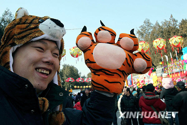 2月13日,一位年輕人戴著“虎帽”和“虎爪”在北京地壇公園逛廟會(huì)。新華社發(fā)(陳曉根 攝)