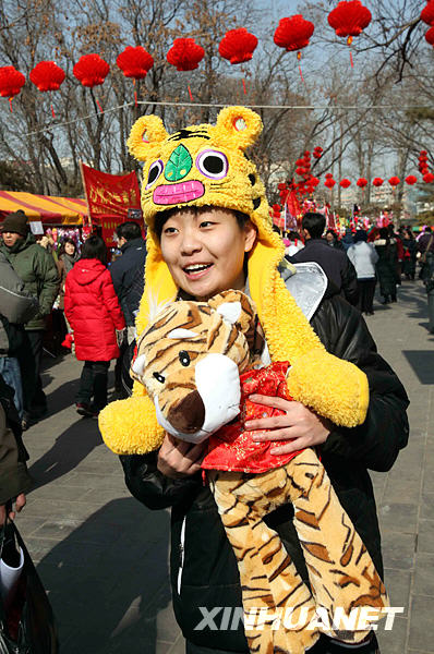 2月13日,一位女孩頭戴“虎帽”,抱著虎玩偶在北京地壇公園逛廟會(huì)。新華社發(fā)(陳曉根 攝)