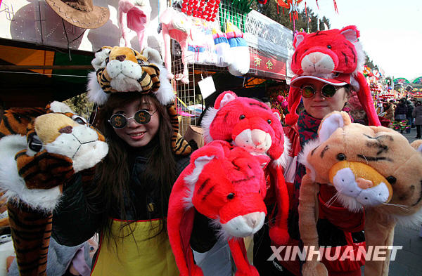 2月13日,兩位年輕人在北京地壇公園展示“虎帽”。農(nóng)歷虎年即將來臨,各種虎主題玩具成為春節(jié)廟會(huì)上的寵兒。新華社發(fā)(陳曉根 攝)