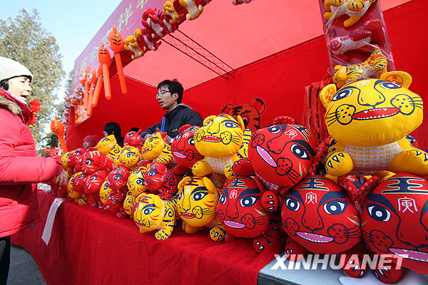 2月13日,游人在北京地壇公園廟會(huì)選購(gòu)吉祥虎。新華社發(fā)(陳曉根 攝)