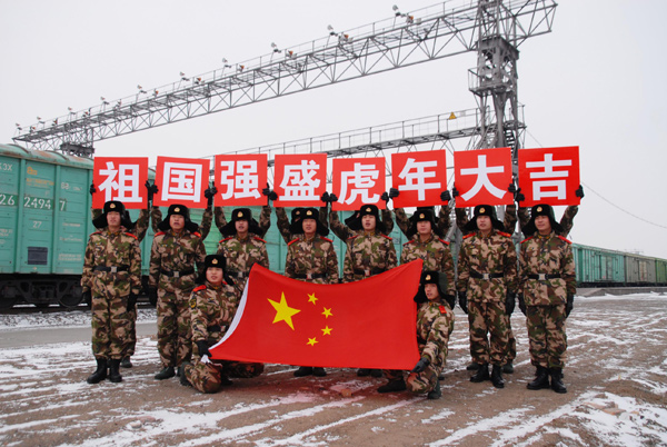 堅(jiān)守在阿拉山口邊檢站的武警官兵們祝愿祖國強(qiáng)盛,祖國人民虎年大吉(2月13日攝)。 春節(jié)期間,阿拉山口邊檢站執(zhí)勤官兵們在堅(jiān)守崗位的同時(shí),也為奔波在旅途上的旅客們送上真摯的祝福。新華社發(fā)(何競舟 攝)