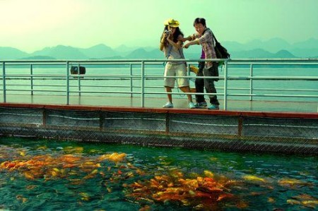 吉祥魚在魚樂橋上。魚樂橋也是一座水上浮橋,浮橋中間水池內放養著78種千島湖淡水魚,其中鯉魚爭食是這里的一大奇觀。千島湖中體型最大、分量最重的螺螄青就放養于此,陪伴它的,還有號稱“白娘子”的大白鳙魚。