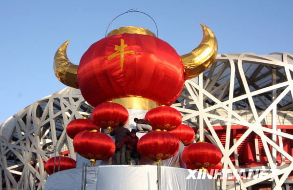1月24日,工人們?cè)凇傍B(niǎo)巢”前安裝牛年主題燈籠。