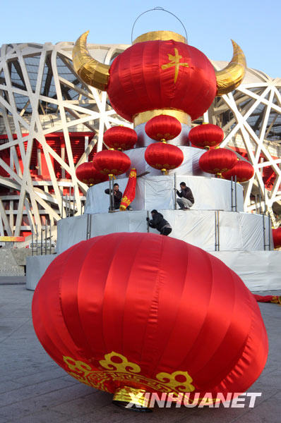 1月24日,工人們?cè)凇傍B(niǎo)巢”前安裝牛年主題燈籠。新華社發(fā)(吳長(zhǎng)青 攝)