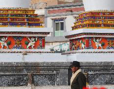 3月14日,當地一名藏族牧民在塔爾寺轉經。