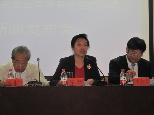 北京市臺聯會長蘇輝(中)、北京市崇文區副區長周永明(右)在記者會上介紹臺灣會館和臺灣商務區的相關情況。