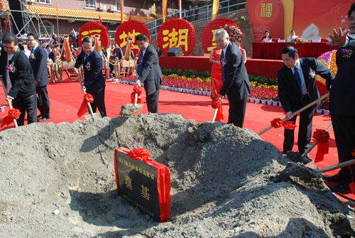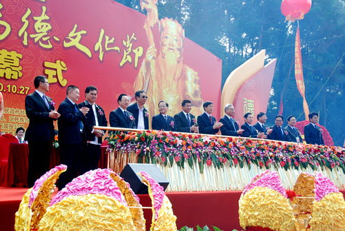 湖里區委書記李棟梁、福建省海峽文化研究會會長楊華基、臺灣寺廟金蘭會會長王增榮、新加坡道家總會會長陳添來、廈門市政協副主席陳昌生先后在開幕式上致辭。海峽兩岸關系協會副會長張銘清宣布第三屆福德文化節開幕并邀請在場嘉賓共同推動啟動桿啟動開幕。現場的嘉賓為福德文化墻和海峽兩岸非物質文化遺產(仙岳山)展示中心項目奠基儀式培土。