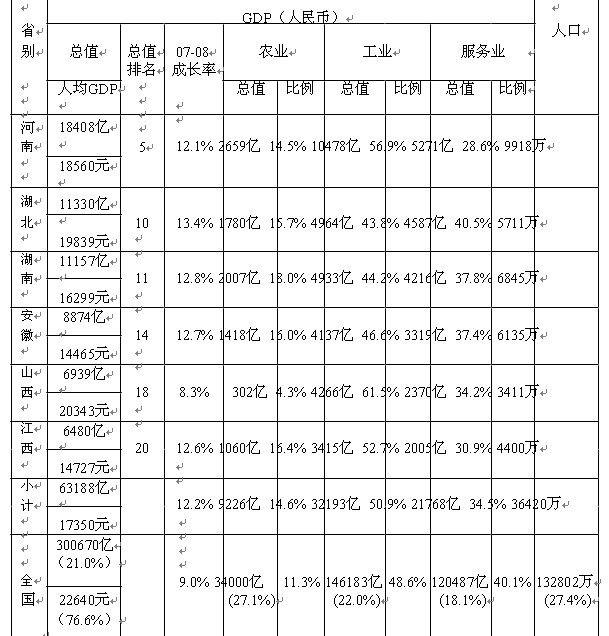 表一 中部六省國(guó)民經(jīng)濟(jì)現(xiàn)況,2008