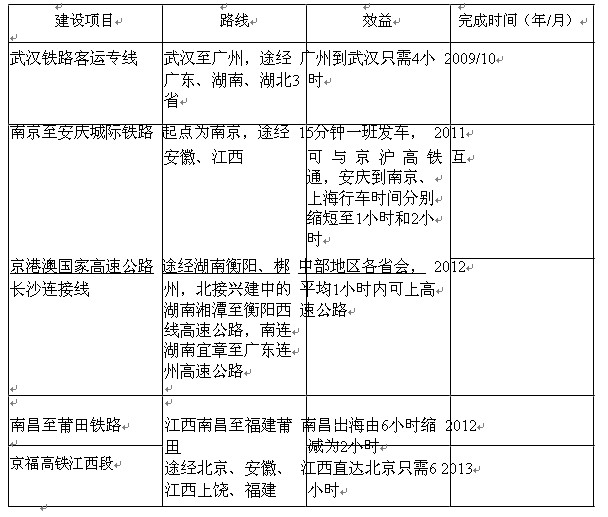 在這四兆擴(kuò)大內(nèi)需方案中,中部六省的交通建設(shè)是重點(diǎn)中的重點(diǎn),包括將交會(huì)于武漢的兩條南北高速鐵路—新京廣與滬漢蓉,通過南昌的京福高鐵,以及連結(jié)中部六省各省會(huì)的京港澳國(guó)家高速公路長(zhǎng)沙連接線等等。一條又一條的鐵公路所構(gòu)成的網(wǎng)絡(luò),未來將打通華中六省的任督二脈,縮短中部六省到沿海地區(qū)的交通時(shí)間,打造出4小時(shí)內(nèi)的經(jīng)濟(jì)圈與生活圈。(見圖一)
