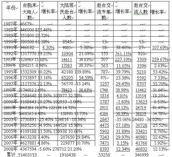 表1:大陸臺(tái)灣歷年往來(lái)人數(shù)統(tǒng)計(jì)表