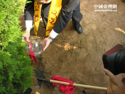 焦仁和把專程從臺灣帶來的日月潭水輕輕倒進樹坑中。(中國臺灣網 蕪同 攝)