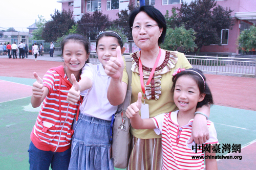 臺灣云林縣北辰小學校長丁招弟和同學們合影 (中國臺灣網 董潔 攝)