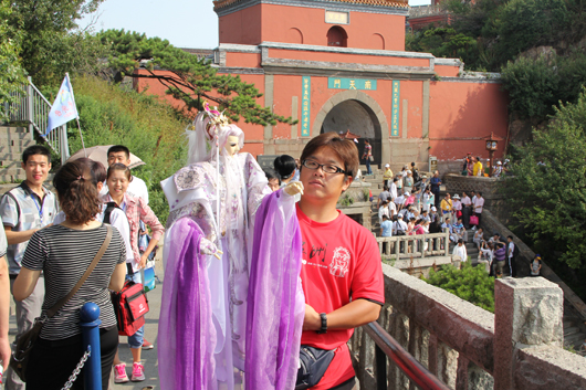 臺灣嘉賓帶著布袋戲的木偶主角一起爬泰山。(中國臺灣網(wǎng) 芮益芳 攝)