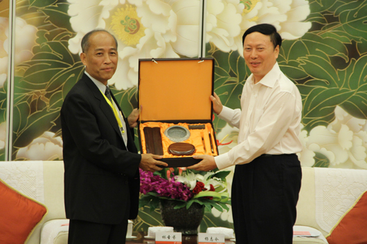 臺(tái)灣團(tuán)團(tuán)長(zhǎng)與山東省的領(lǐng)導(dǎo)互贈(zèng)禮物。(中國(guó)臺(tái)灣網(wǎng) 芮益芳 攝)
