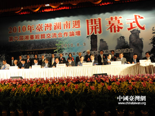 8月3日下午,由湖南省海峽兩岸交流促進會、臺灣工業總會和臺北世界貿易中心聯合主辦的“2010年臺灣湖南周”暨第六屆湘臺經貿交流合作論壇在臺北圓山飯店隆重開幕,湘臺兩地簽訂合作備忘錄、項目合作協議和采購協議24項。(湖南省臺辦 李蘭 攝)