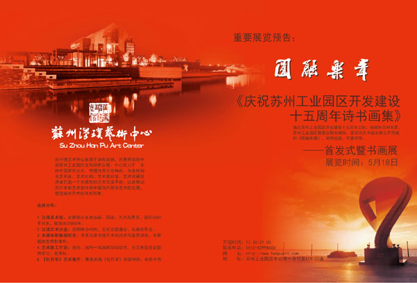 值此蘇州工業(yè)園區(qū)開發(fā)建設十五年之際,由政協(xié)蘇州市委、蘇州工業(yè)園區(qū)管委會聯(lián)合編輯、薈萃詩文書畫名家之作而成的“慶祝工業(yè)園區(qū)開發(fā)建設十五周年詩書畫集”——《圓融樂章》首發(fā)式暨書畫展將于5月18日在李公堤漢璞藝術中心舉辦。
