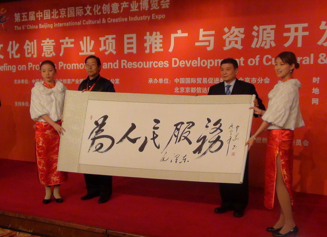 文博會組委會辦公室副主任、北京市貿促會副會長倪躍剛接受藝術家為文博會創作的書法作品