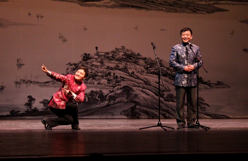 國家一級相聲演員李偉建、武賓表演的相聲《天天習(xí)舞》以說唱結(jié)合的表演方式,形象生動的肢體動作,讓在場觀眾無不前仰后合,拍手叫好,兩度返場演出,讓本是同根同源的兩岸文化交流沒有任何距離。應(yīng)寧、王磊表演的對口相聲《講四書》以風(fēng)趣幽默的表演方式,融入當(dāng)?shù)卣Z言元素,充分展現(xiàn)了中華民族的文化魅力。劉穎、浩楠表演的相聲《減肥》以反諷的方式結(jié)合熱點(diǎn)話題,用詼諧幽默的語言,既愉悅了觀眾又展示了中華民族的語言魅力。這些精彩的語言藝術(shù)表演,讓當(dāng)?shù)孛癖姼苯恿私庵腥A民族傳統(tǒng)文化,感知兩岸親情,認(rèn)同同根同源。北京雜技團(tuán)的《女子雙人柔術(shù)》運(yùn)用各種“頂”的技巧和“連續(xù)軟翻”、“雙人造型”等優(yōu)美動作征服了在場的每位觀眾。年輕魔術(shù)演員王璐的魔術(shù)《伊人花影》,如夢如幻,也為臺灣觀眾留下了深刻的印象。臺北曲藝團(tuán)的快板演員林文斌也同臺獻(xiàn)藝,表演了快板《武松打店》。