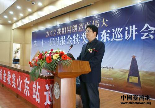 中國臺灣網(wǎng)4月25日濟南消息 日前,“第二十一屆時報金犢獎山東站巡講會”在山東大學法學院禮堂舉行。旺旺集團濟南分公司總監(jiān)李丹、金犢獎組委會代表、旺旺中時傳媒總經理助理林洛安先生、北京杰爾思行廣告有限公司執(zhí)行創(chuàng)意總監(jiān)龍杰琦先生、山東大學藝術學院副院長李平教授及來自山東十余所高校的師生近五百人參加會議。與此同時,“往屆金犢獎優(yōu)秀獲獎作品展”在山東大學藝術學院舉辦。市臺辦宣傳調研處陪同臺胞參加活動。