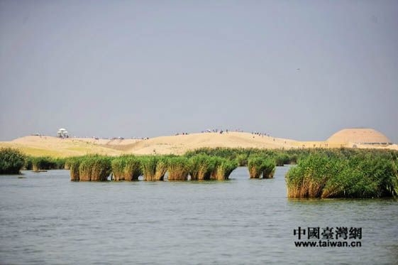 中國臺灣網8月14日銀川消息 巍巍賀蘭,茫茫沙山,叢叢蘆葦,萬頃碧波。8月14日,2013全國網絡媒體寧夏行記者團來到名聞遐邇的國家5A級景區寧夏沙湖,陶醉于“沙”與“湖”完美融合締造的綺麗風景。