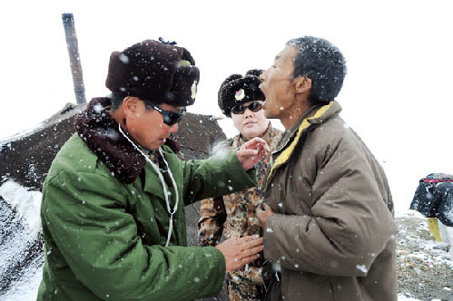 西藏軍區(qū)副司令員兼西藏軍區(qū)總醫(yī)院院長(zhǎng)李素芝在錯(cuò)那災(zāi)區(qū)冒雪為牧民巡診