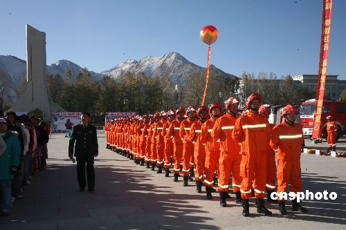圖為擔負消防、救災(zāi)等任務(wù)的西藏救援武裝力量首次集體亮相