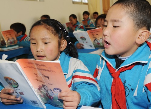 3月9日,拉薩第一小學(xué)學(xué)生格桑央吉(左)、扎拉玉杰在讀藏文課本。 新華社記者 索朗羅布 攝