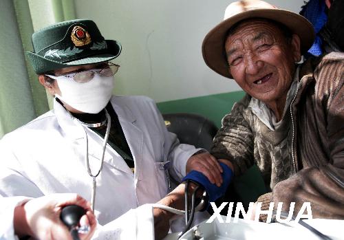 資料圖片:3月23日,武警西藏總隊醫院醫生為一位藏族老阿爸量血壓。新華社發(錢檬 攝)