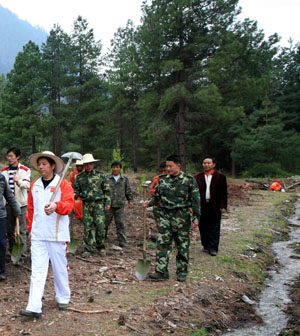 圖為廣東援藏干部、察隅縣委書記彭聰恩為新栽培樹苗澆水。