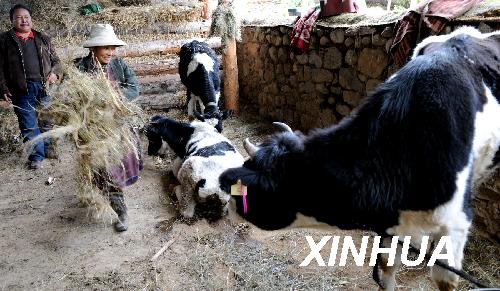 資料圖片:西藏林芝地區林芝縣巴果繞村農民正在給從內地引進的黑白花奶牛喂飼料(2008年10月29日攝)。新華社記者 索朗羅布 攝