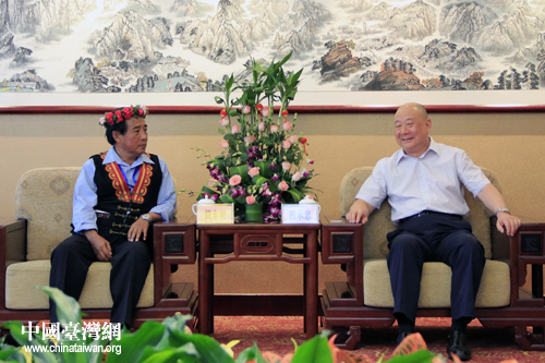 湖北省副省長田承忠25日下午在恩施會見了率臺灣少數民族代表前來參加恩施女兒會的中華海峽兩岸少數民族交流協會理事長簡東明一行。(中國臺灣網 楊麗 攝)
