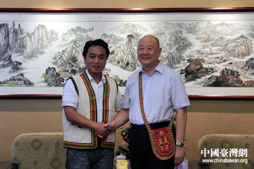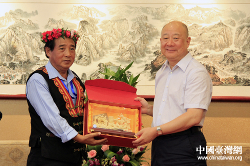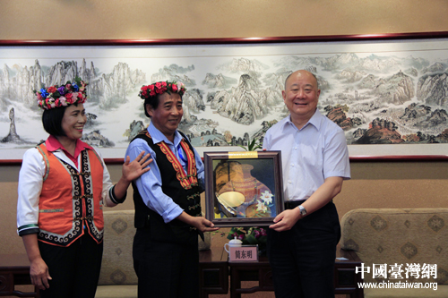 湖北省副省長田承忠25日下午在恩施會見了前來參加恩施女兒會的臺灣少數民族代表一行,會見后臺灣代表向田承忠贈送禮物。(中國臺灣網 楊麗 攝)