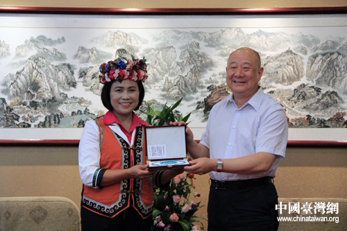 湖北省副省長田承忠25日下午向臺灣少數民族代表賴錦花贈送禮物。(中國臺灣網 楊麗 攝)