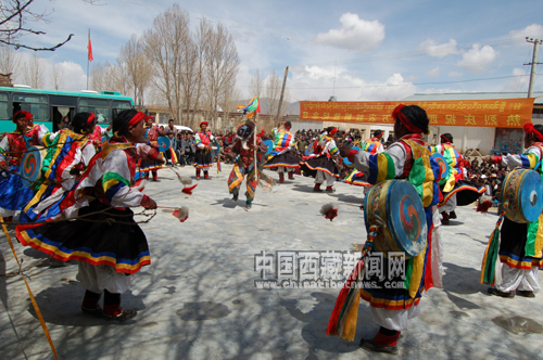 近日,日喀則市司馬卓鼓舞、扎西吉彩金銀銅器制作技藝、江洛康薩青稞酒制作技藝、朋必涼粉制作技藝通過自治區驗收,被列為第三批自治區級非物質文化遺產保護名錄。目前,初三賽馬節、后藏藏歷新年正在申報之中。圖為日喀則市甲措雄鄉司馬卓鼓舞農民演員在表演古老的司馬卓鼓舞。巴喬 攝