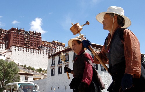 兩名老阿媽從布達(dá)拉宮前轉(zhuǎn)經(jīng)走過(guò)(2006年6月22日拍攝)。新華社記者 格桑達(dá)瓦 攝
