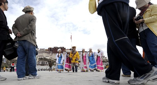 資料圖片:7月29日,來自內地的游客在布達拉宮廣場前留影。新華社記者 普布扎西 攝