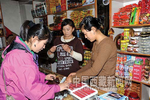 2009年6月,拉薩來的游客白央(左)在樟木口岸一家旅游商店購物。(圖片來源:《西藏日報》王緒彬 攝)