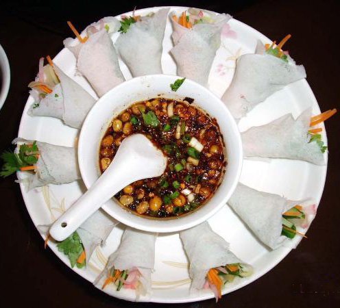 烙。面粉加水,鹽少許揉勻挪透(水與面粉比例為1:6),平鍋燒熱刷油、擦干,然后左手抓起面團甩圓并向鍋底杵一下成為直徑為9厘米的圓薄皮時,右手立即把圓形面皮揭起,這樣制作數(shù)十張春卷皮,放入蒸籠稍蒸一下使其回軟,便于包食。再將綠豆芽、海帶絲、芹菜節(jié)、蕨菜節(jié)用開水氽過,分別裝入小盤中,小碗內放入醬油、醋、味精、麻油、姜沫、蔥花、煳辣椒兌成汁。春卷皮中放入各種素菜絲包成上大下小的兜形,放入酥黃豆,澆淋兌好的辣椒汁即成。