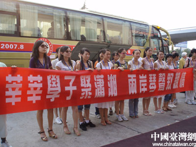 圖為剛剛下飛機(jī)的臺(tái)灣學(xué)子們拉開(kāi)橫幅,心情像天氣一樣火辣。