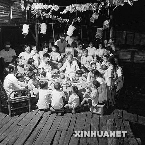 這是20世紀(jì)50年代,81歲的老漁民郭汝一家四代同堂共55人在中秋節(jié)夜大團(tuán)聚,歡度佳節(jié)(資料照片)。 新華社發(fā)