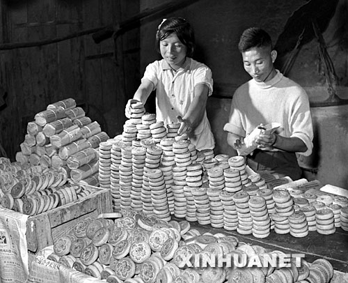 這是1961年9月21日,山西省聞喜縣東鎮(zhèn)供銷合作社的工作人員在包裝月餅,準(zhǔn)備供應(yīng)農(nóng)民過中秋節(jié)(資料照片)。 新華社發(fā)