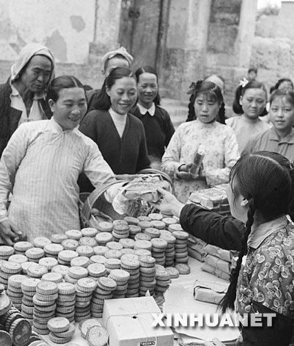 這是1963年中秋節(jié),山西省運(yùn)城縣大渠公社寺北村大隊(duì)的社員在購買本村供銷點(diǎn)供應(yīng)的月餅(資料照片)。 新華社發(fā) |