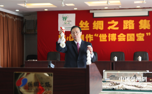 絲綢之路集團(tuán)董事長(zhǎng)凌蘭芳介紹在倫敦首屆世博會(huì)獲得金牌的湖州輯里湖絲仿制件與現(xiàn)代工藝制作的湖絲(中國(guó)臺(tái)灣網(wǎng) 李典典攝)