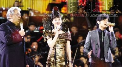 宋祖英、多明戈、周杰倫在鳥巢同臺演出。