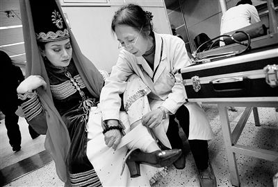 新疆藝術(shù)劇院歌舞團的米娜腳受傷了,醫(yī)務(wù)人員在她排練的間隙幫她換藥。米娜說,雖然腳有點疼,但她不會“下火線”
