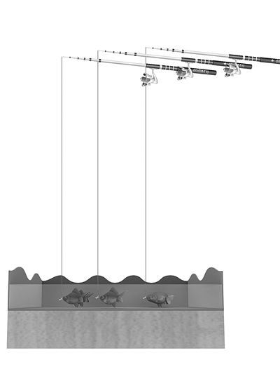 魔術(shù)師的助手在天花板上用魚(yú)線勾著魚(yú)餌誘魚(yú)。