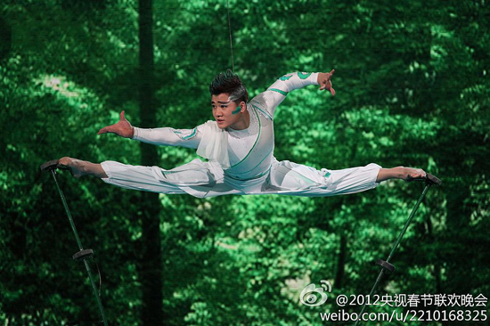 富有詩意的名字《空山竹語》卻是暗藏玄機。這是一個高難度的雜技節(jié)目。主舞臺彩幕和立體景觀營造的竹海,與身著白色長衫的雜技演員搖擺的“翠竹”隨風飛舞,一切輕靈飄逸。