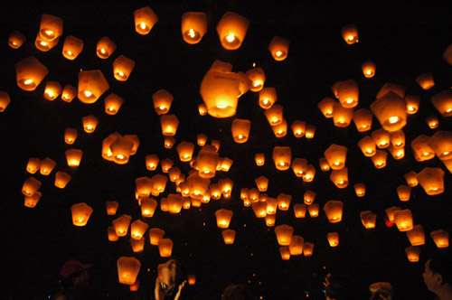 所謂“做天燈”,就是在紙糊的燈狀球體下點火,利用熱空氣上升的原理將其送上夜空。天燈用白色宣紙糊制,造型很像一頂孔明帽,故而又稱“孔明燈”。天燈的“帽沿”用竹片圍成圓形,用兩根鐵絲在圓形竹片之間架成十字形,燃料固定在十字形的中間交叉點上。糊扎天燈首重平衡,否則升上天空即刻就會燃燒起來,化為烏有。“天燈”有大有小,冉冉升起后,猶如一個個大大小小閃爍的火球,隨風飄向遠方,與夜空中的繁星融為一體,妙不可言。人們更相信,天燈放得愈高,運氣就愈好。