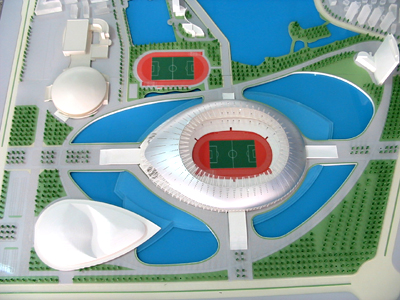 天津奧林匹克中心體育場位于天津西南部的奧林匹克中心內,占地34.5公頃,建筑面積15.8萬平方米,總投資14.8億元,2003年8月動工。設計方案是由日本佐藤綜合計畫公司完成的,整體上突出了"綠色奧運"、"科技奧運"和"人文奧運"三大理念。整個中心體育場占地7·8萬平方米,建筑面積15·8萬平方米,該體育場南北長380米,東西長270米,高53米,設計分為六層。既可滿足國際足球和田徑比賽要求,而且還設有賣場、展館、會議廳、健身室等多項輔助設施,是融群眾休閑、娛樂、健身、購物為一體的綜合性體育場。一層設有室內停車場22670平方米,展示場3460平方米,餐飲用房6400平方米,健康中心5930平方米,運動員、裁判員等競賽用房屋4010平方米;二層設有專賣店3840平方米,健康中心130平方米,國際會議中心85平方米;三層設有運動健身廳4320平方米,健康中心130平方米,國際會議中心85平方米;四層設有包廂4166平方米,國際會議中心3030平方米,健康中心1440平方米;五層設有國際會議中心345平方米,健康中心1300平方米。