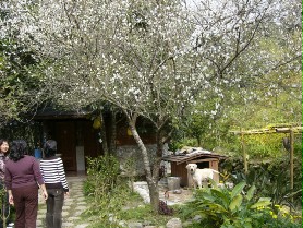 南莊鄉(xiāng)田美村2鄰22之3號(hào)蘭亭咖啡民宿占地9公頃,除了庭園、木屋,屋后是偌大的桃、李果園,主人許金桂當(dāng)初開墾時(shí),保留了原有的果樹,融入庭園景觀,元旦后梅花盛開,一樹白華,風(fēng)過處片片白雪飄落,美景醉人。
